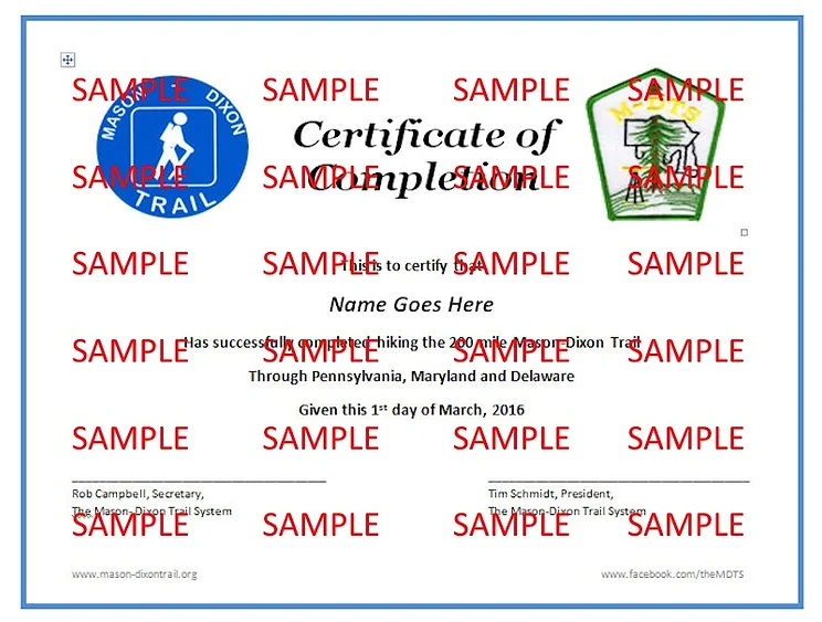 If you have completed a hike or run of the entire Mason-Dixon Trail, please Contact Us. Regardless of whether you completed the entire 200 mile M-DT all at one time or completing it in section hikes over one or more years, you are entitled to a M-DT Completion Certificate. If available, send us a copy of your trip log, photos or anything else that would help us learn your story. If agreeable, we’d like to share your story in our newsletter.