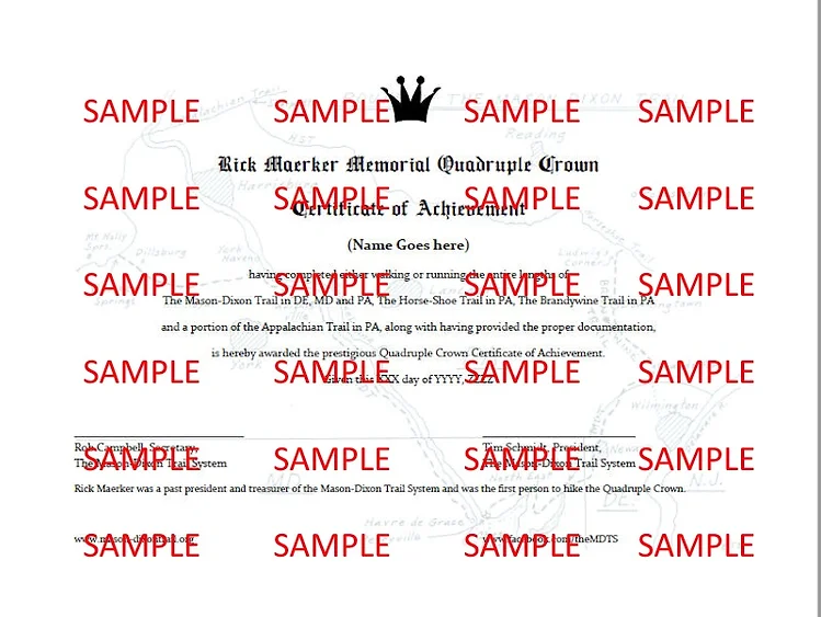 Also, if you complete what is called the Quadruple Crown, you will also receive a certificate of completion from us. The ‘Quad Crown’ is a huge 428 mile loop consisting of the 200 mile Mason-Dixon Trail, the 53 mile Brandywine Trail, the 140 mile Horse-Shoe Trail and 35 miles of the Appalachian Trail in PA.