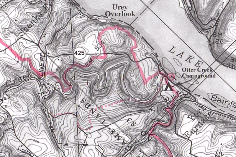 Cross Rt 425 Otter Creek bridge and follow blue blazes left over guardrail. Follow blue blazes; trail crosses road and then climbs up to Urey Overlook.